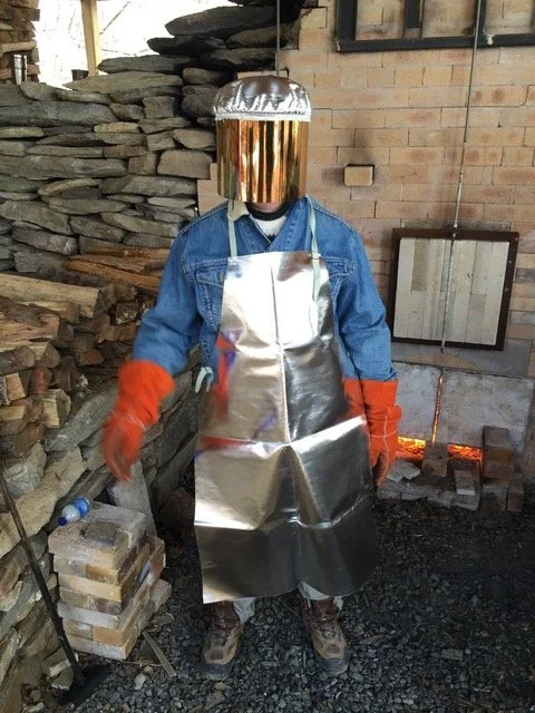 Here is Kate’s husband all tricked out for full safety during a wood firing. I recently had a really good conversation with Linda Christianson about good safety gear, and how it makes you relaxed and able to do you job well without hurry or stress, which benefits the firing. Hurrying a stoke or overcompensating because the firebox is too hot to approach can damage the ware you are working so hard to produce.
