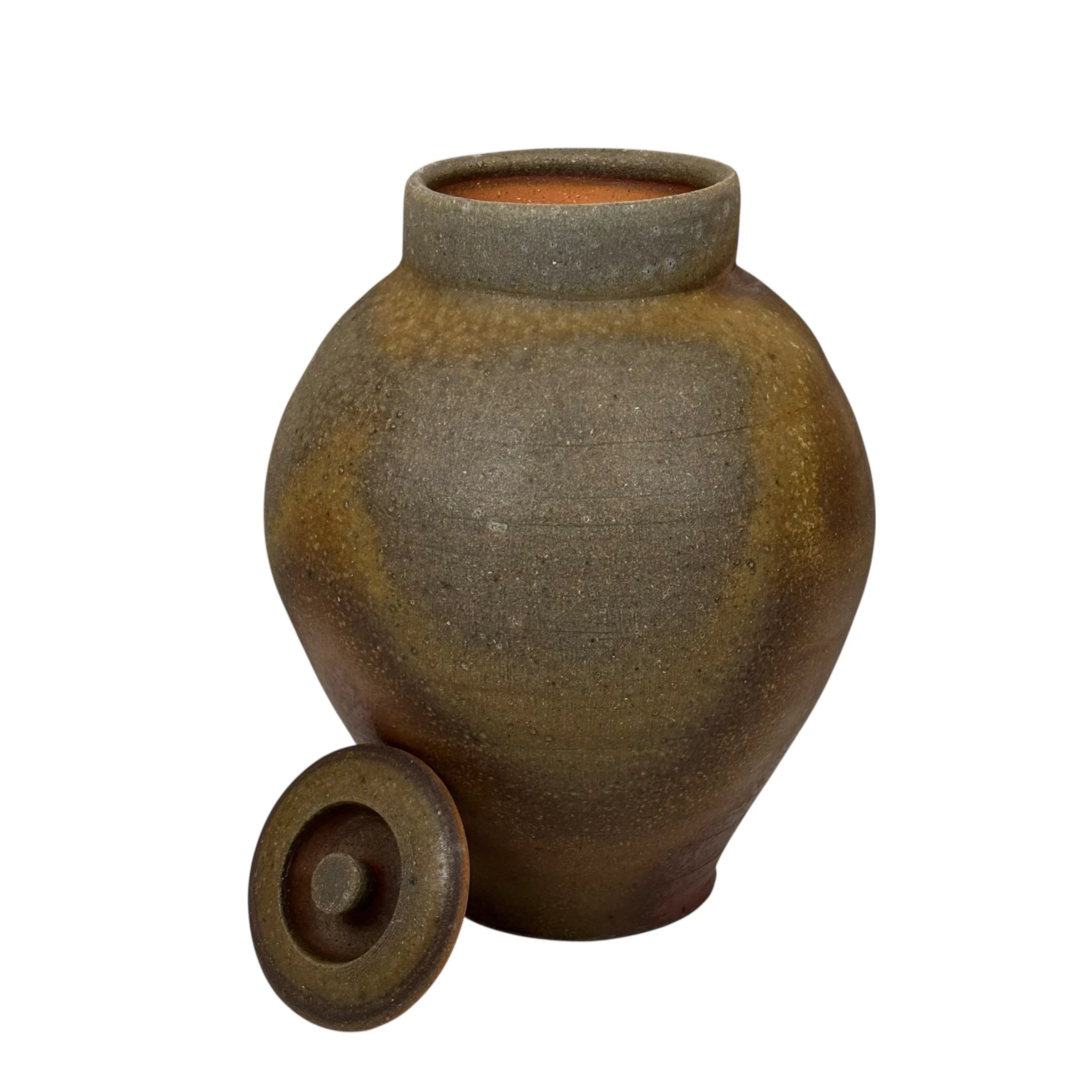 Image 1 of 8 Image 2 of 8 Image 3 of 8 Image 4 of 8 Image 5 of 8 Image 6 of 8 Image 7 of 8 Image 8 of 8 Golden Lidded Jar $280.00 Woodfired high iron stoneware 10”x8”x8” Add To Cart Added! Woodfired high iron stoneware 10”x8”x8”