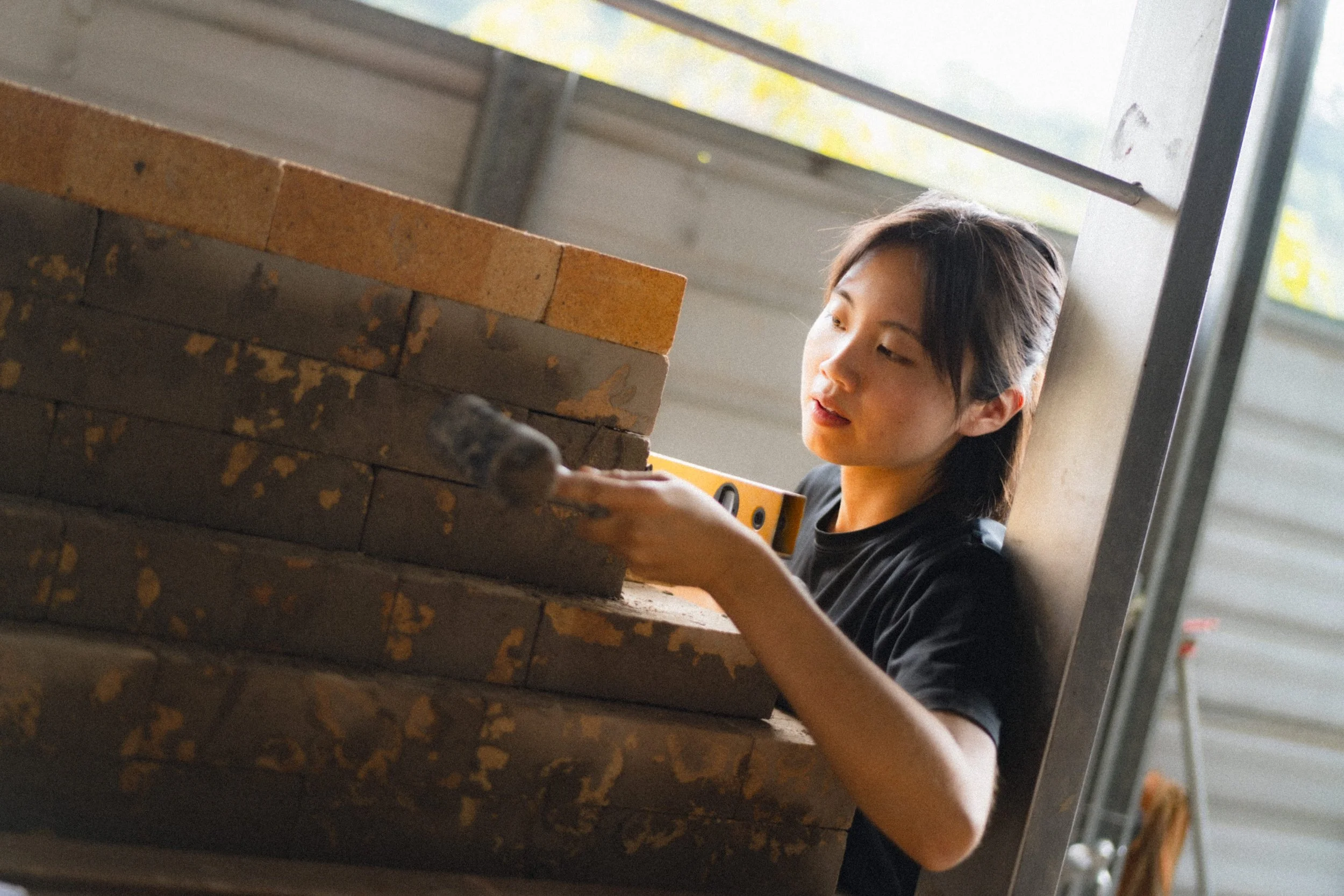Yumi and Yishin laying the first layers down. The brick that are pulled out will be for side stoking.